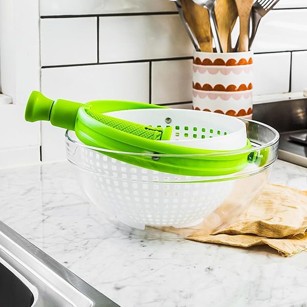 3-in-1 Strain, Spin & Store: Smart multifunctional design lets you wash, drain, and spin-dry fruits, vegetables, and salad greens using one convenient tool.